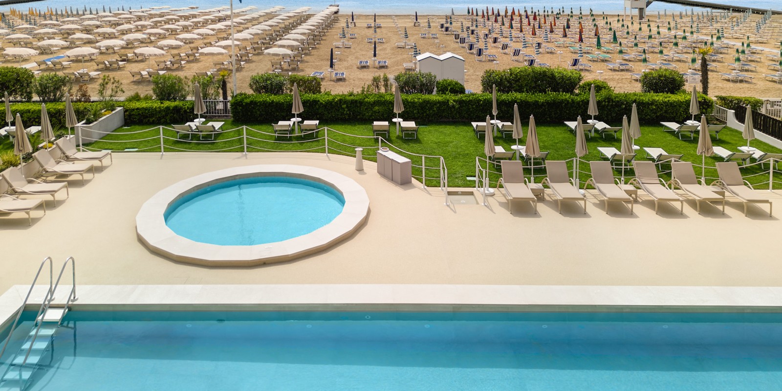 Das Hotel Aurora ist ein wunderbarer Ort in ruhiger Lage, wo man einen Urlaub direkt am Meer im Zeichen von Wellness und Relax richtig genießen kann. Gleichzeitig liegt es im Herzen von Jesolo, ganz in der Nähe der Shoppingmeile. Das Hotel bietet jeglichen Komfort einer 4-Sterne-Anlage, geräumige Zimmer auch für Familien, WiFi-Verbindung, beheizter Pool bei 28°, Wellness-Center, Restaurant mit À-la-carte-Menü, Privatstrand, Fahrräder und Sondertarife für Golf und Fitness.